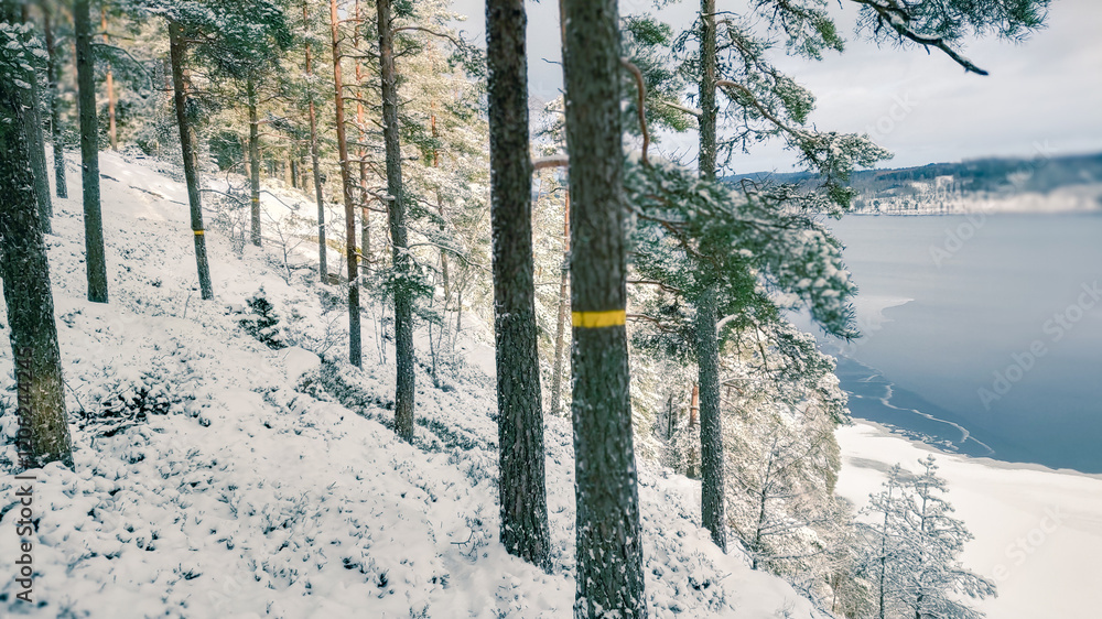 Winter landscape - frosty trees in winter forest in cold weather. Calm winter forest nature under snowfall in cloudy day