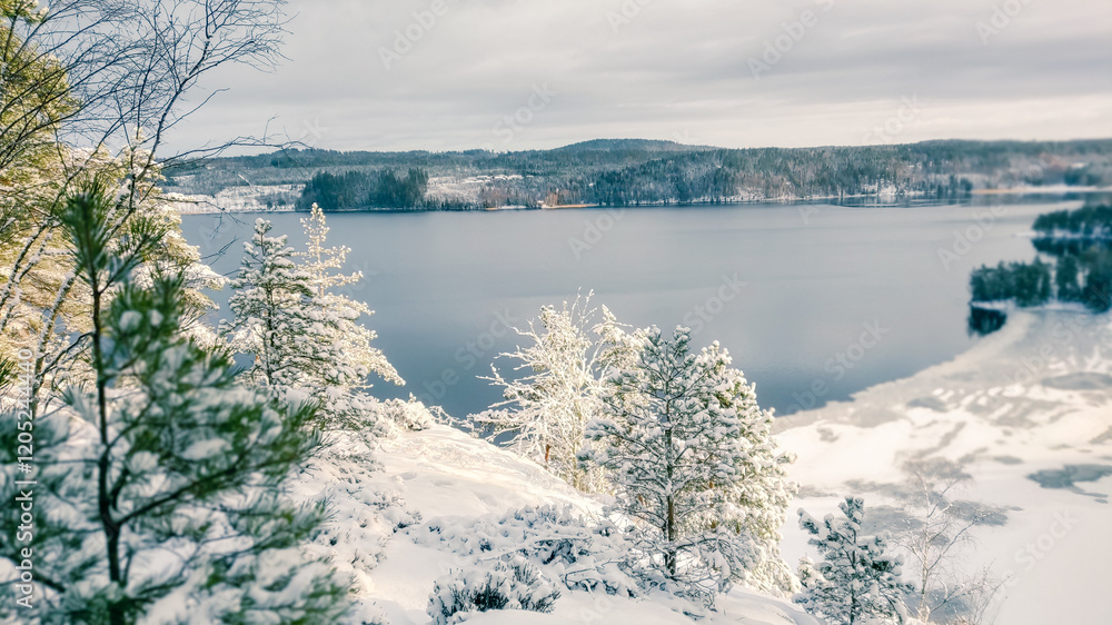 a winter landscape where a beautiful lake stretches across the scene. The center of the lake is still open water, reflecting the gray winter sky and the snow-covered trees that line its edges. On one