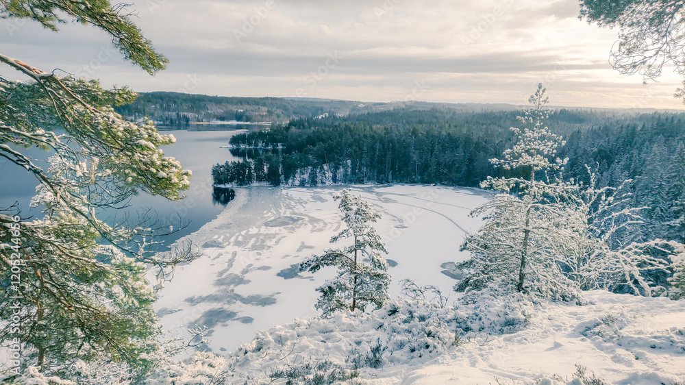 a winter landscape where a beautiful lake stretches across the scene. The center of the lake is still open water, reflecting the gray winter sky and the snow-covered trees that line its edges. On one
