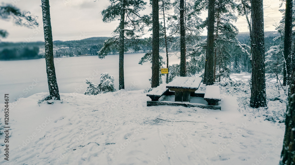 a winter landscape where a beautiful lake stretches across the scene. The center of the lake is still open water, reflecting the gray winter sky and the snow-covered trees that line its edges. On one