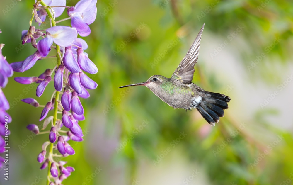 Delicate lavender petals of purple wisteria blooms with hummingb