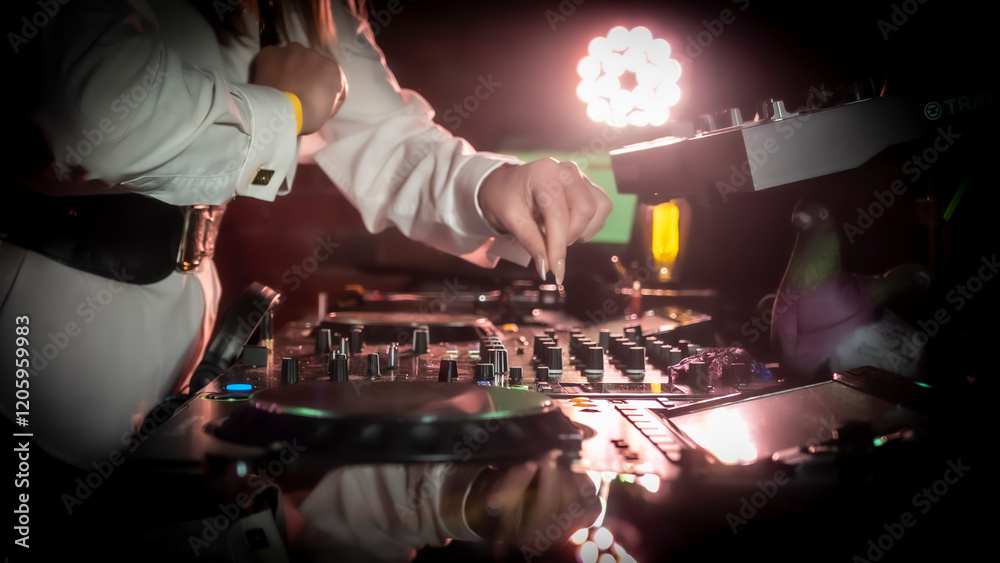 Close up DJ plays live set and mixing music on turntable console in the night club. Disc Jokey Hands on a sound mixer station at club party. DJ mixer controller panel for playing music and partying.