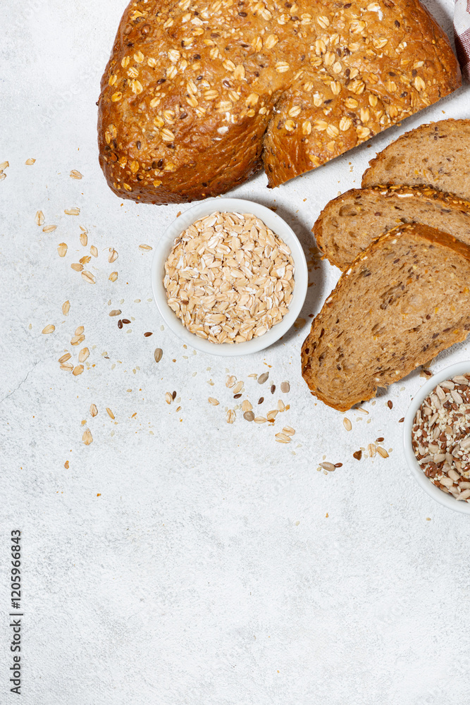 healthy bread with oatmeal and seeds on white background, vertical top view