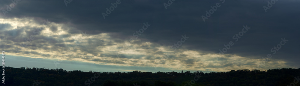 Dark silhouettes of trees on a hillside of clouds in the morning sky.