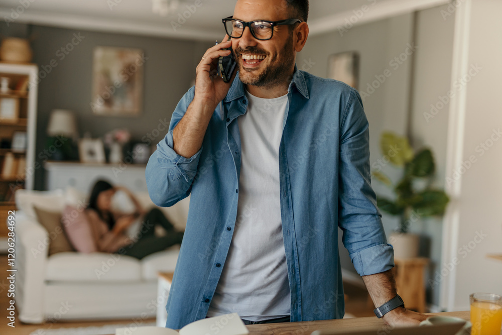 Young professional freelancing at home, talking on a phone in a stylish, well-lit living room. A woman enjoying on the sofa in the background