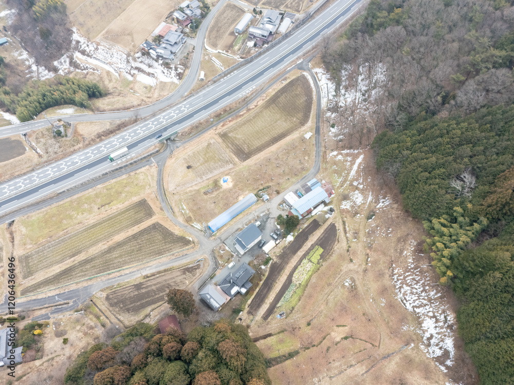 Aerial shot of snow-covered winter landscape of Iida City, Nagano Prefecture using drone