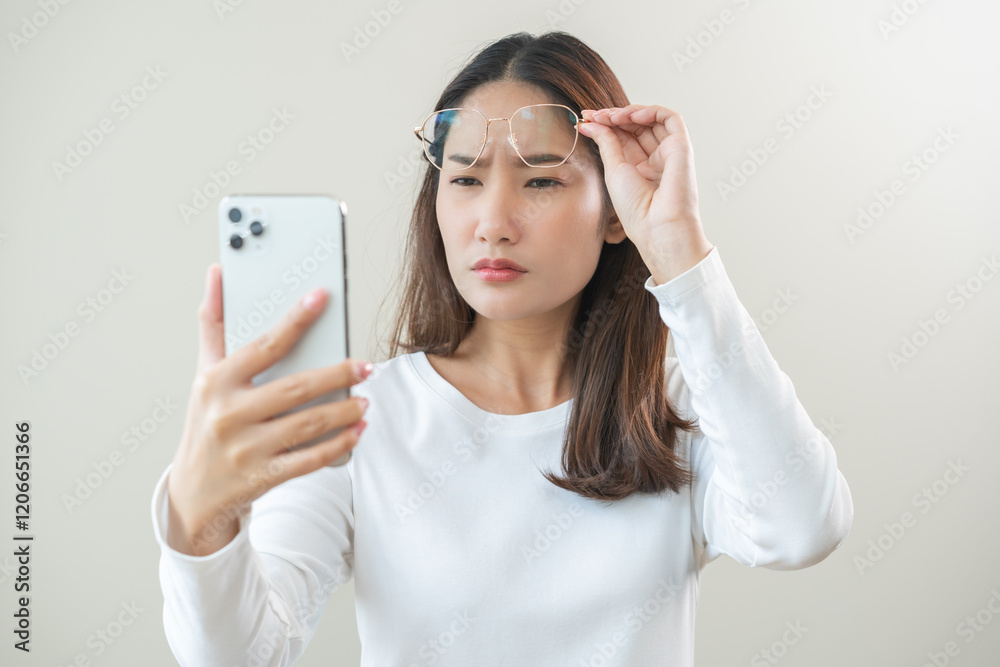 Presbyopia, Hyperopia middle aged asian woman holding eyeglasses problem with vision blurred ,trying to read text message from smart mobile phone screen, eye disease of old, eyesight farsightedness.
