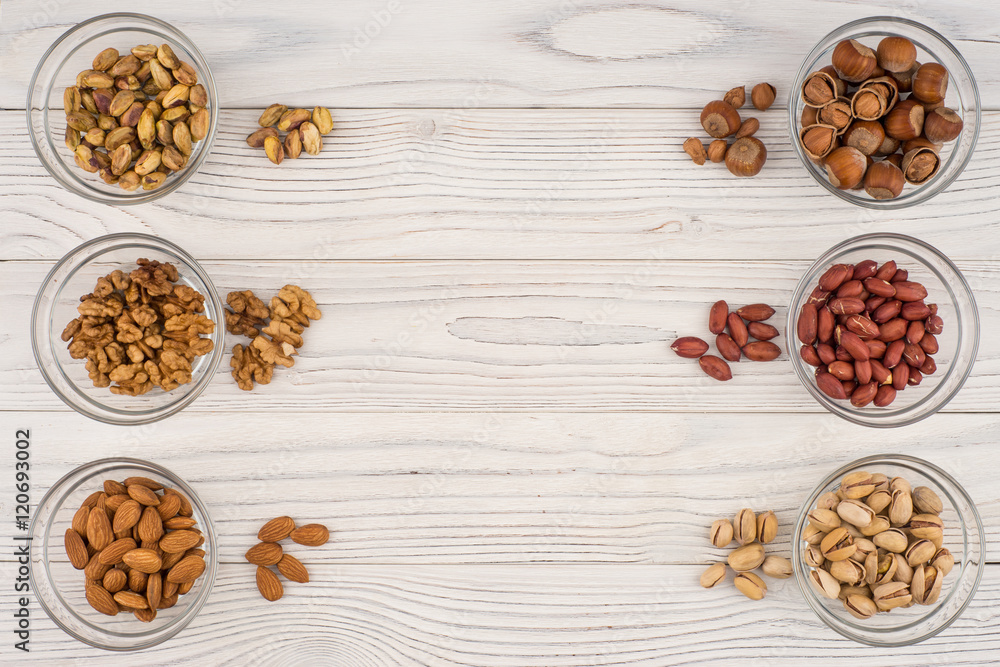 Mix nuts in a glass bowl on the old wooden table.