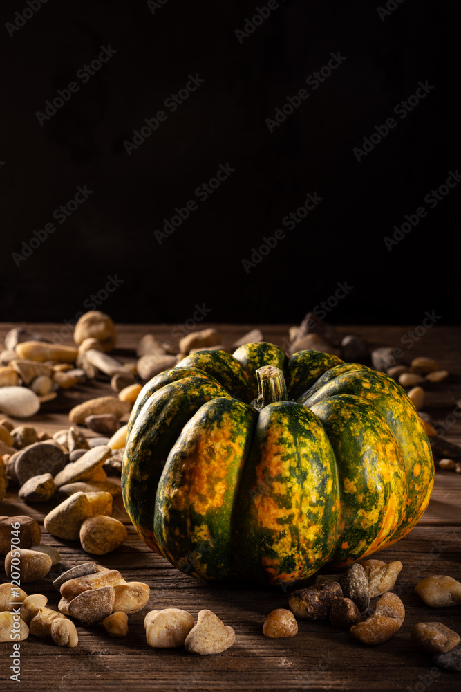 pumpkin placed on a rustic wooden table, with pebbles and burlap cloth.
