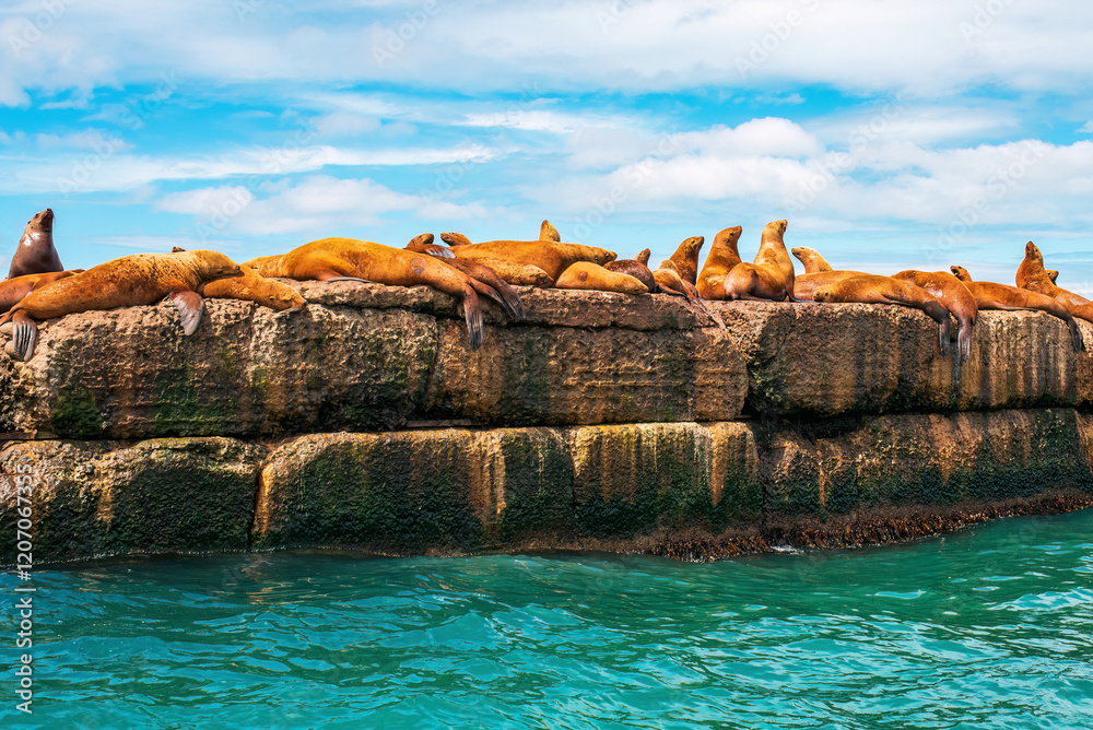 The rookery of Steller sea lions. A group of northern sea lions on a breakwater in the sea near Nevelsk City, Sakhalin Island