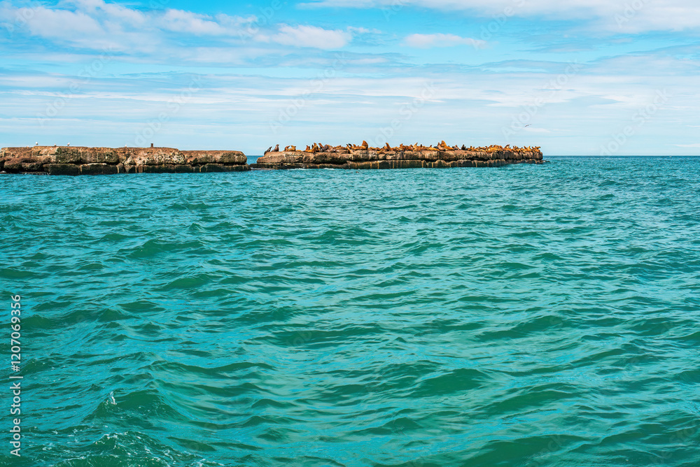 The rookery of Steller sea lions. A group of northern sea lions on a breakwater in the sea near Nevelsk City, Sakhalin Island