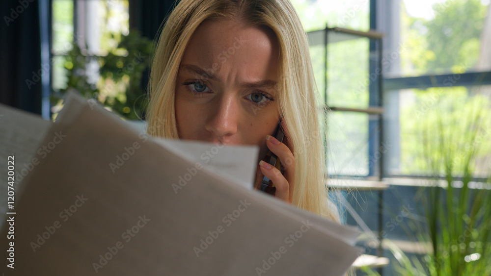 Annoyed angry stressed Caucasian business woman entrepreneur mad irritated shout at phone in office female businesswoman solve documents problem financial mistake arguing scream finishing mobile call