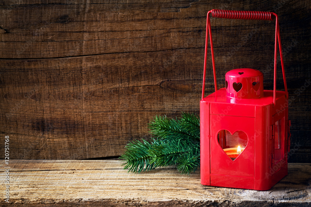Red Christmas lantern with a lit candle and fir branches on dark rustic wooden background. With plenty of copy space for your text