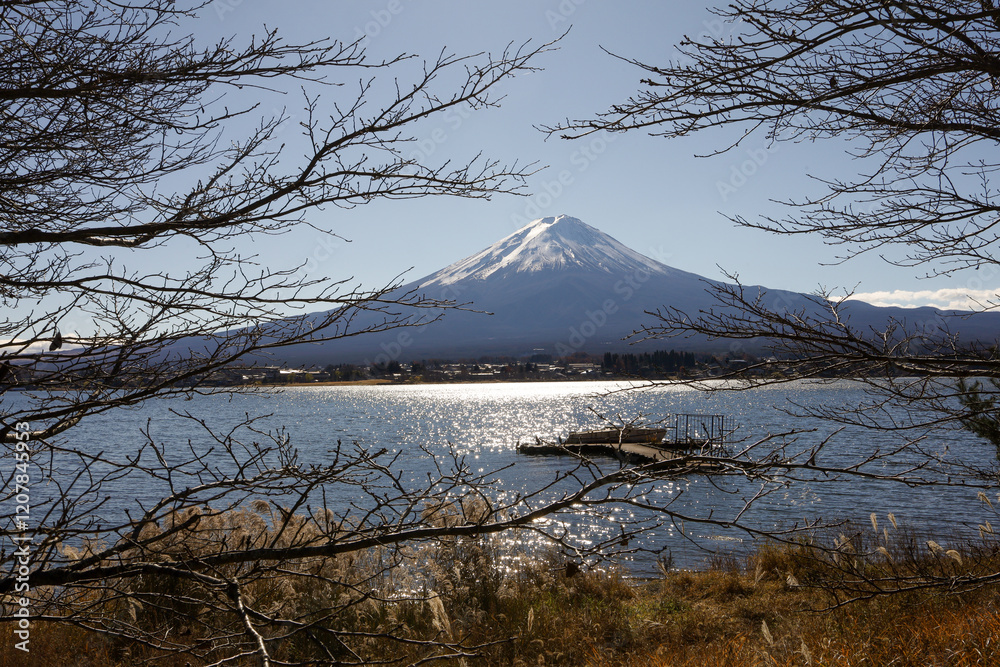 View of landscape fuji mountain in winter at Lake Kawaguchi