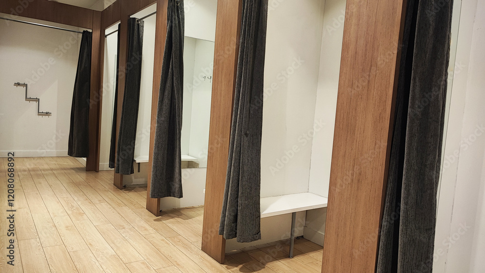 Empty changing rooms with wooden doors and white walls. Dressing rooms of a clothing store with no people. Shopping concept.