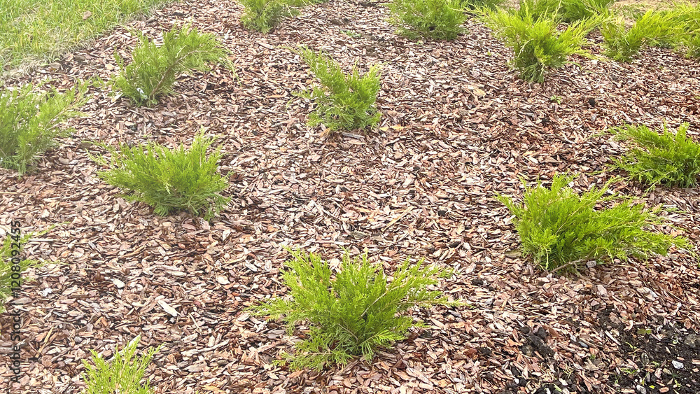 A field covered in brown leaves and grass, with a few small bushes scattered throughout. Scene is serene and tranquil, as the natural elements blend together in a harmonious way