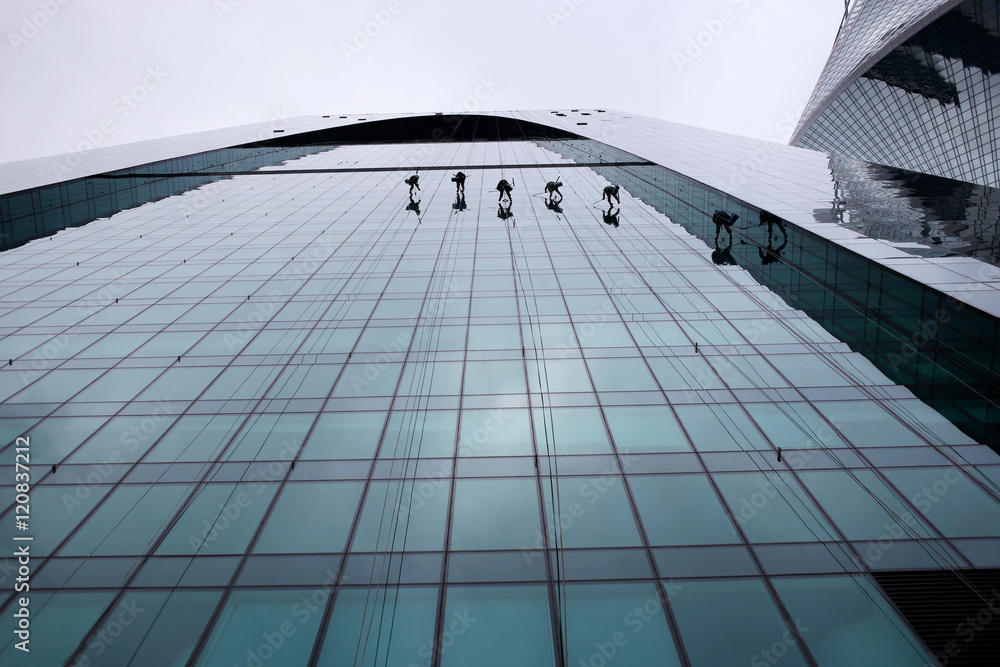 group of workers cleaning windows service on high rise building