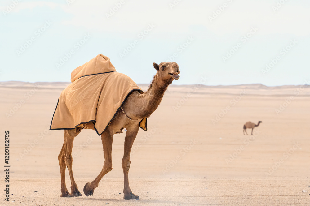Wild desert camel portrait view in desert isolated view. Wild Desert camel roaming on desert walking and searching for food
