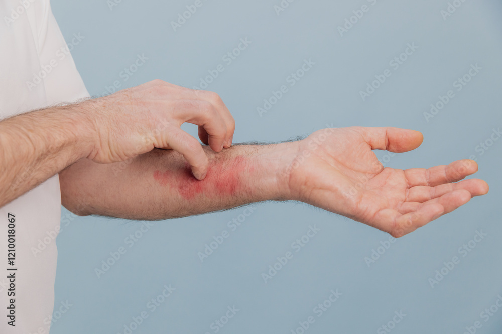 Male hand scratching itchy red rash on forearm skin