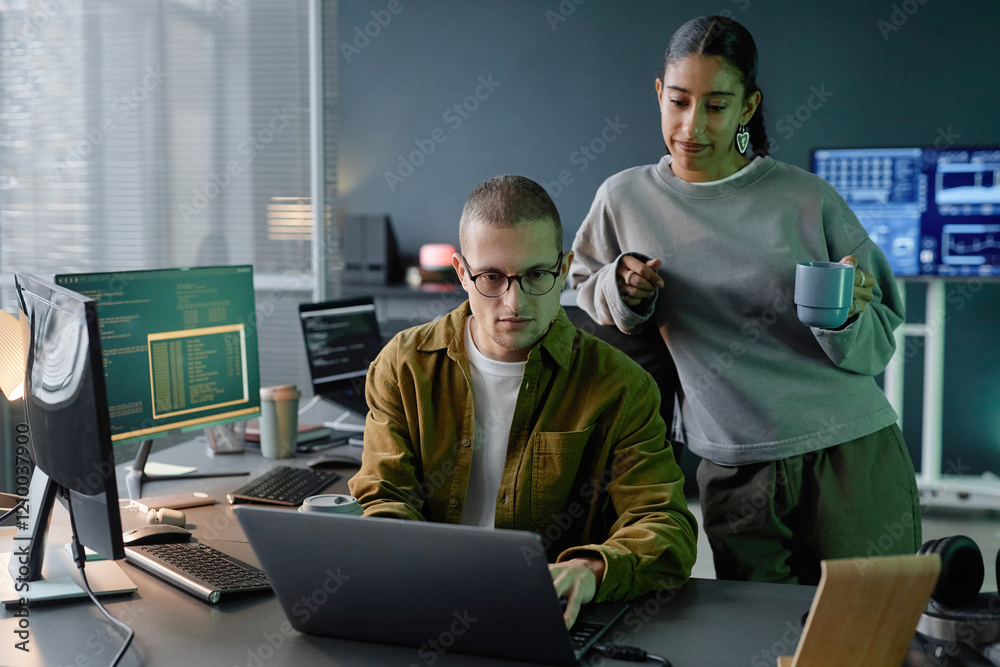 Medium shot of senior male programmer with glasses using laptop reviewing code while helping female junior developer collaborating at working desk in office
