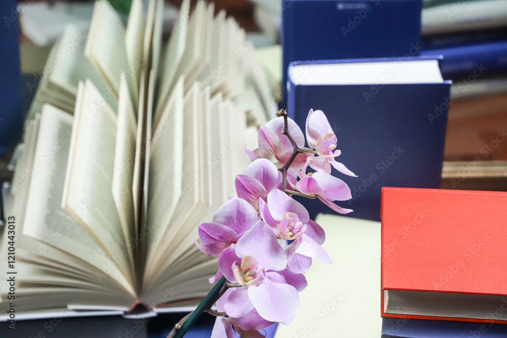 stack of books with orchid, close up. Open book on the table in library. Back to school concept. Open book on table with blur bookshelf background