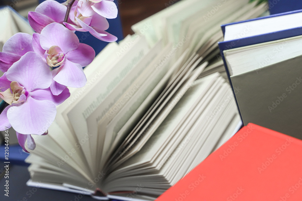 stack of books with orchid, close up. Open book on the table in library. Back to school concept. Open book on table with blur bookshelf background