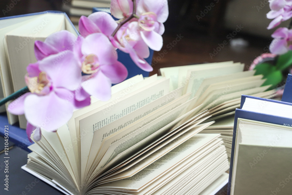 stack of books with orchid, close up. Open book on the table in library. Back to school concept. Open book on table with blur bookshelf background