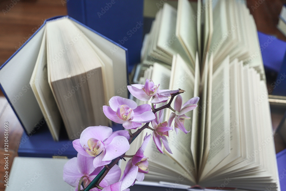 stack of books with orchid, close up. Open book on the table in library. Back to school concept. Open book on table with blur bookshelf background