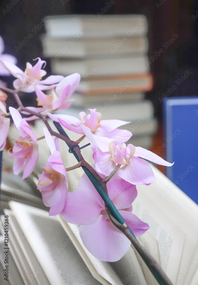 stack of books with orchid, close up. Open book on the table in library. Back to school concept. Open book on table with blur bookshelf background