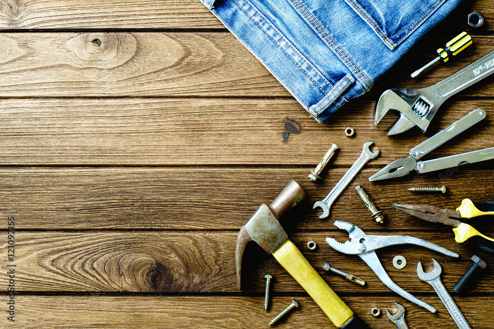 Construction tools and jeans on wooden background