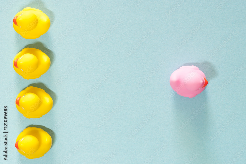 Pink rubber duck standing out from the common yellow ones. Uniqueness, difference, individuality and thinking outside the box concept. (Toned image with selective focus)