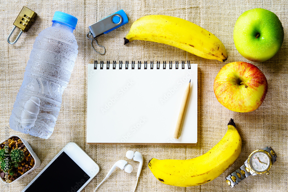 Healthy eating concept, banana, apple, fruit and water bottle ,