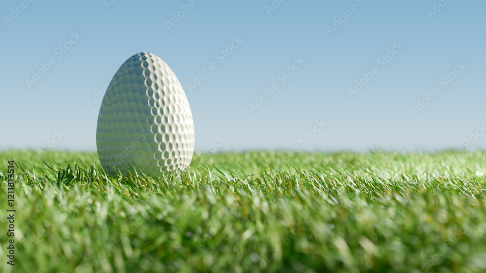 Easter golf ball shaped like an egg on green grass under a clear sky. 3d rendering