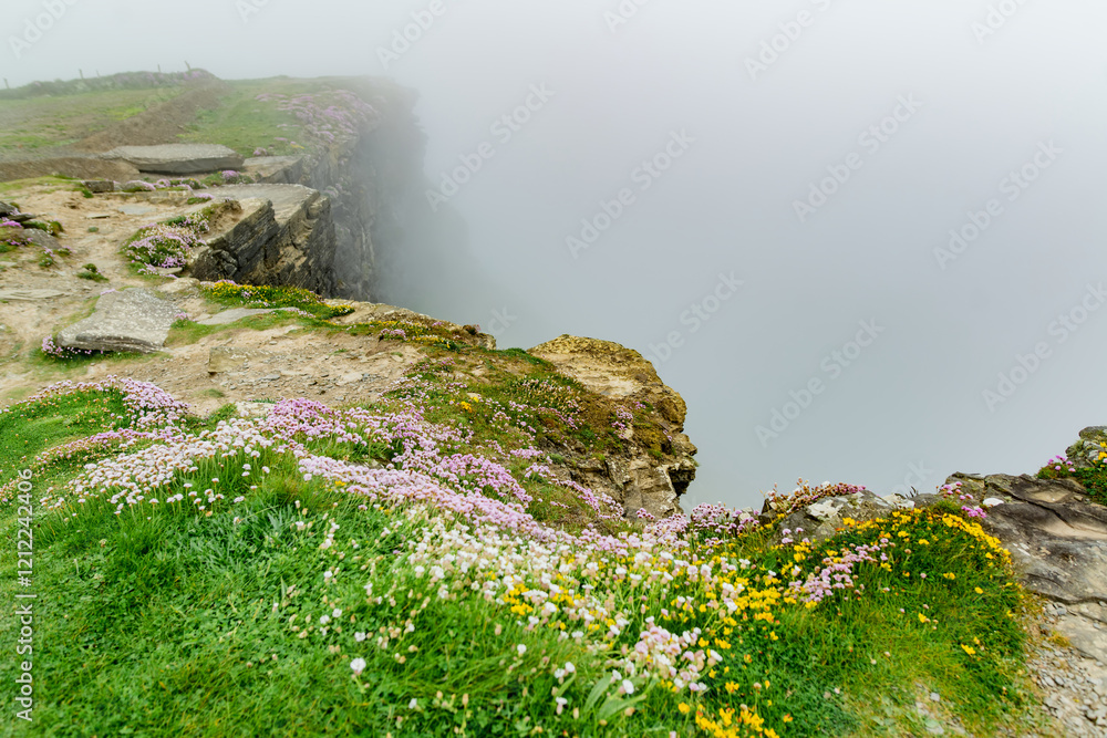 Pink thrift flowers blossoming on the Cliffs of Moher, one of the most popular tourist destinations in Ireland. Foggy view of widely known attraction on Wild Atlantic Way in County Clare.