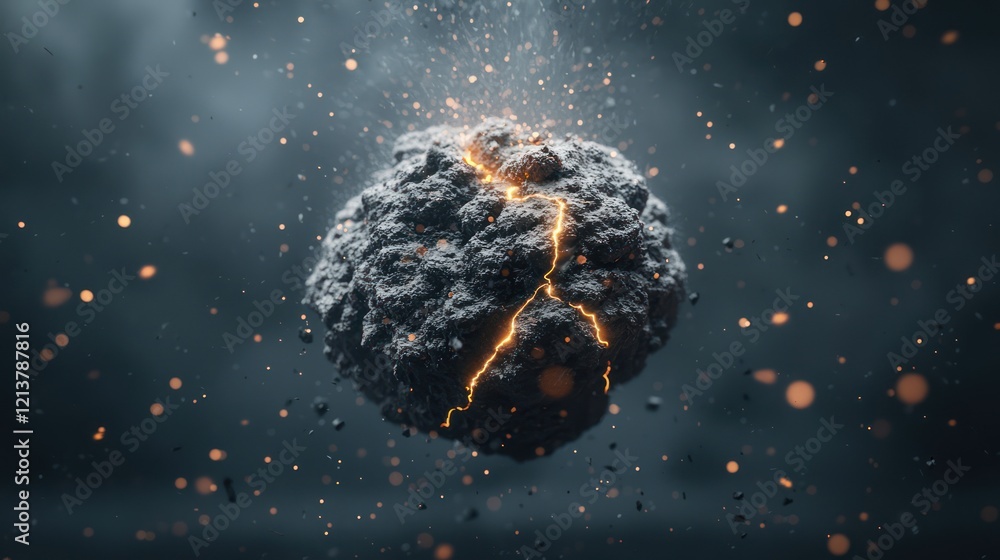 A rocky sphere with glowing cracks floating in a dark, atmospheric background, suggesting a dynamic and powerful scene.