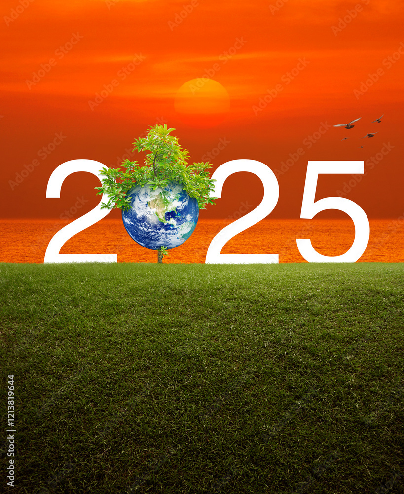 2025 white text with planet and tree on green grass field over sunset sky and sea, Happy new year 2025 ecological cover, Save the earth concept, Elements of this image furnished by NASA