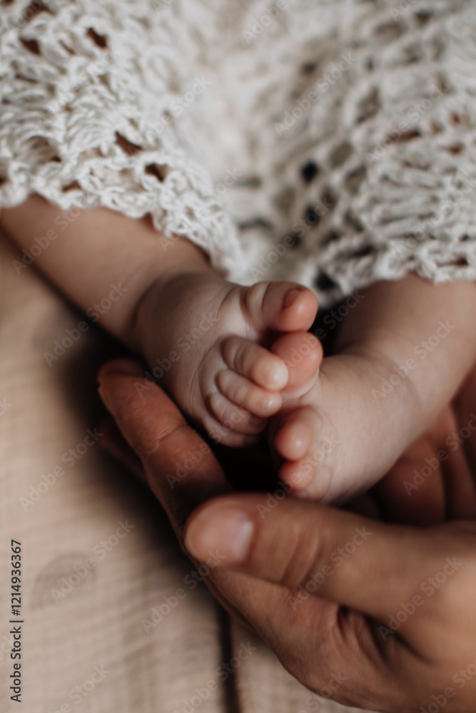 Cute tiny feet of a newborn baby in the hand of a father, fatherhood love child care concept