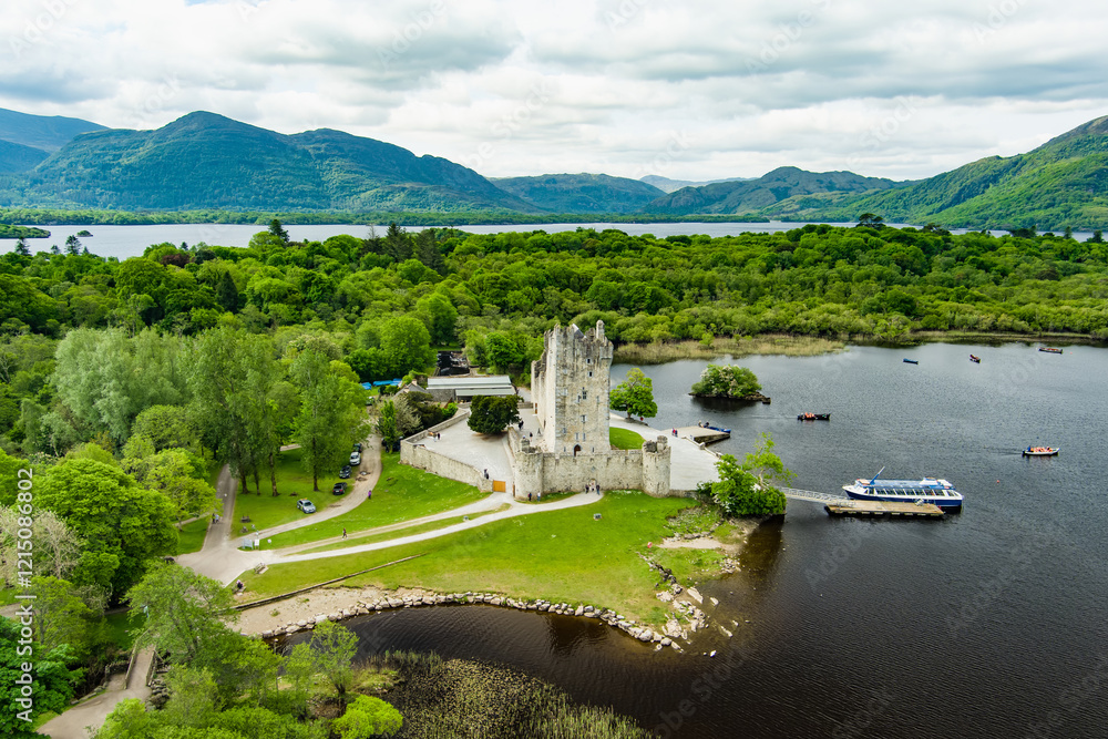 Aerial view of Ross Castle, 15th-century tower house and keep on the edge of Lough Leane, in Killarney National Park, Ireland.