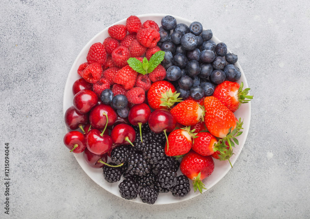 Fresh organic summer berries mix in white plate on light kitchen table background. Raspberries, strawberries, blueberries, blackberries and cherries.