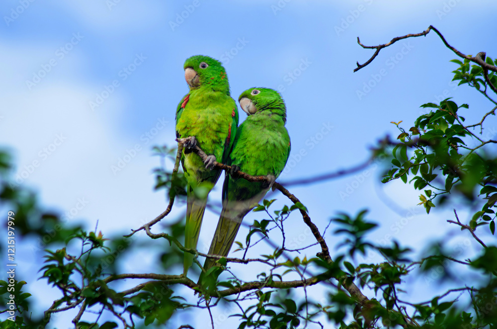 Maritacas, beautiful and friendly maritacas in a jboticabeira in the morning in a city in the interior of Brazil. selective focus.
