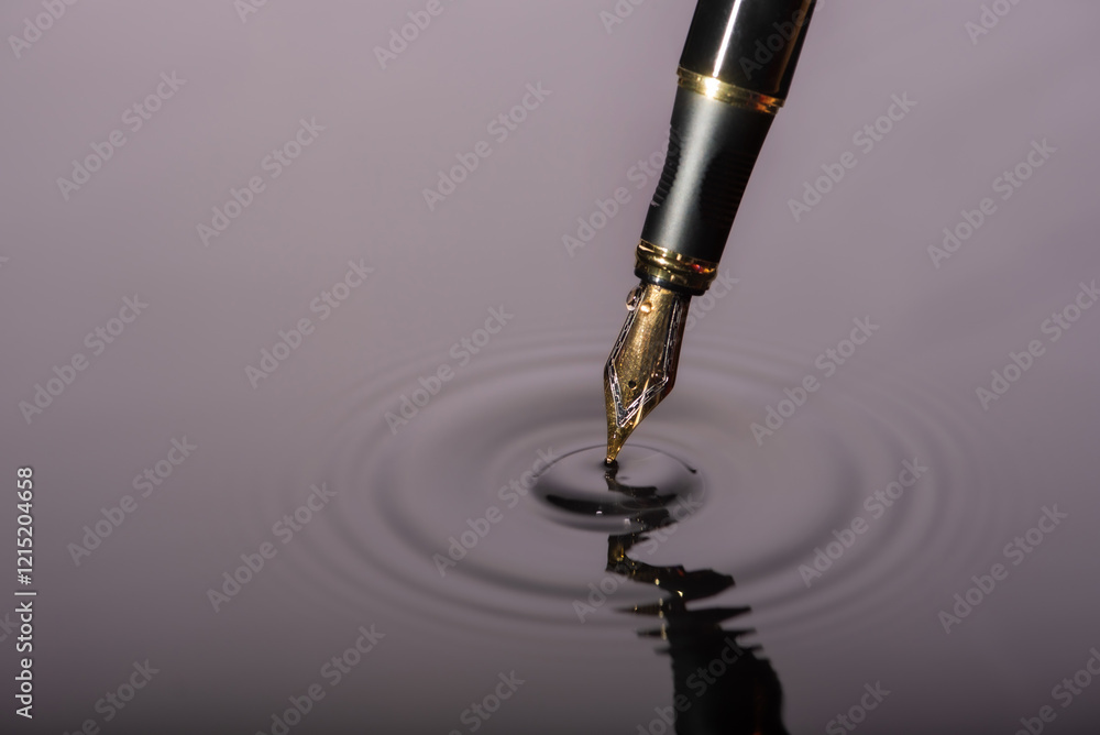 Fountain pen on water, a beautiful fountain pen touching the surface of a water mirror and creating small waves, Selective focus.