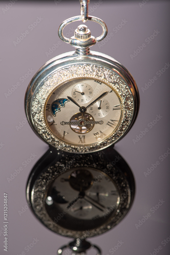 pocket watch over water, a beautiful watch touching the surface of a water mirror and creating small waves, Selective focus.