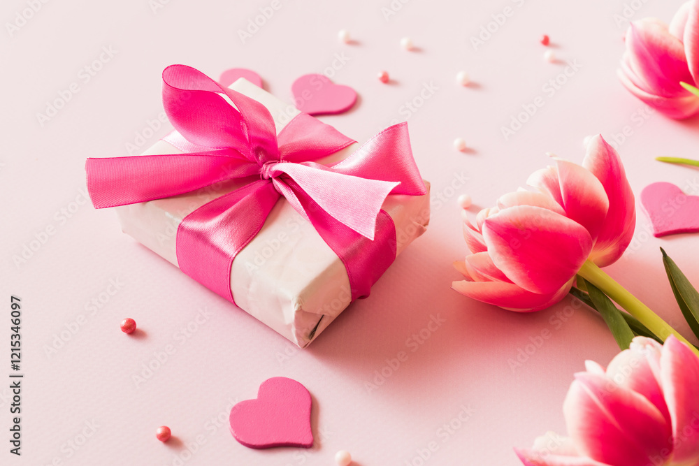 Pink tulips and hearts, gift box with ribbon on light pink background
