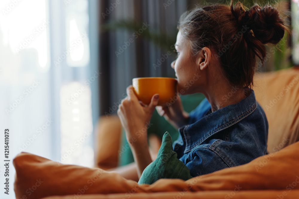 A woman sitting on a couch with a cup of coffee, looking out the window in contemplation