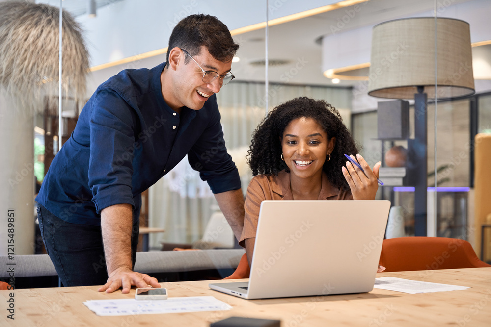 Two young busy diverse colleagues business people using laptop in modern office. Happy team employees working together on computer discussing online technology data solutions at work.