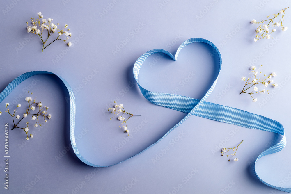 Blue ribbon forming a heart shape with delicate white flowers on a light blue background. Valentines day greeting card. Top view, flat lay