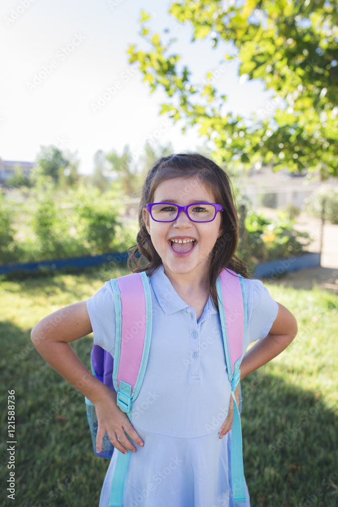 A girl wearing a uniform and a backpack is ready for her first day of school.
