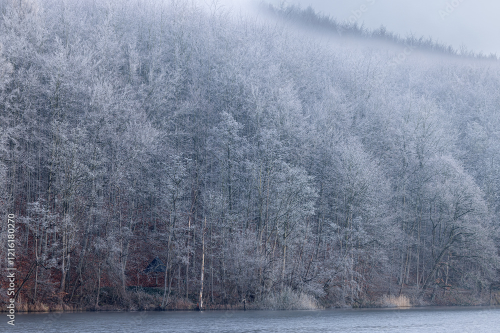 Forest at the lakeshore on a frosty and misty winterday with trees covered with hoarfrost, Ukleisee, Eutin, Schleswig-Holstein, Northern Germany