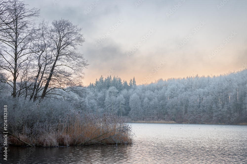 View over lake on a frosty wintermorning, with reed in foreground and forest in abckground, Eutin, Ukleisee, Schleswig-Holstein, Northern Germany