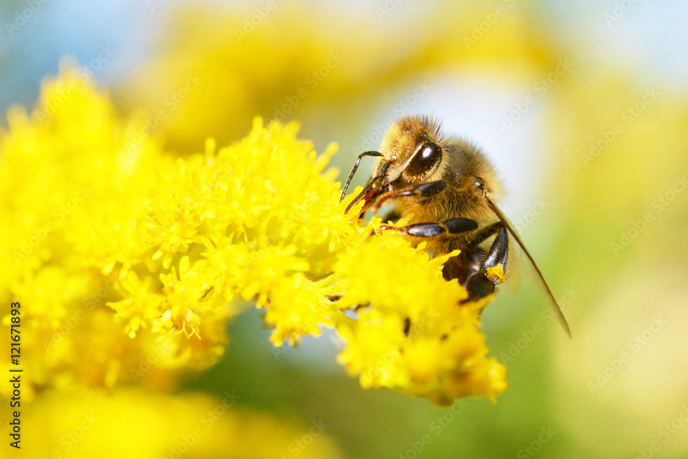Honey Bee on Yellow Flower, sunny day
